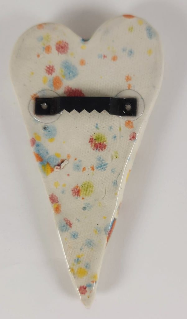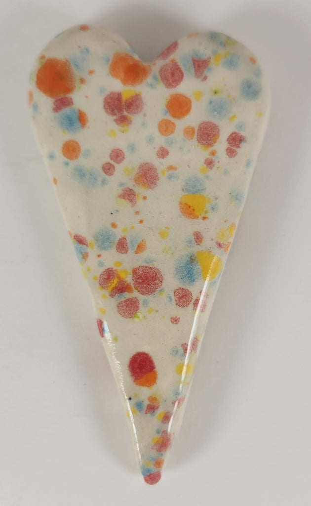 These are one-of-a-kind ceramic hearts. Pictured here are the fronts and backs. The hearts hang by a hook fired into the back. The long hearts measure 5" x 2.5" x .5 inches, while the short hearts measure 3.25" x 3.25" x .5".