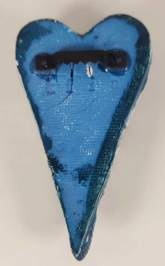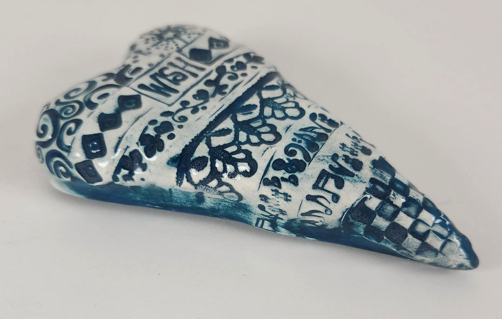 These are one-of-a-kind ceramic hearts. Pictured here are the fronts and backs. The hearts hang by a hook fired into the back. The long hearts measure 5" x 2.5" x .5 inches, while the short hearts measure 3.25" x 3.25" x .5".
